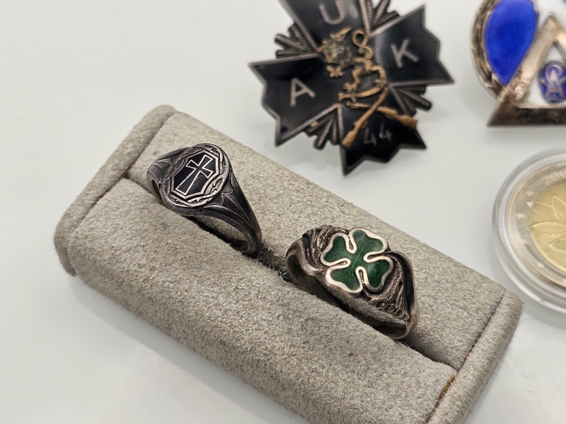 #1649 2€ risuraha + hopeisia merkkejä [mm. AUK '44 -risti]